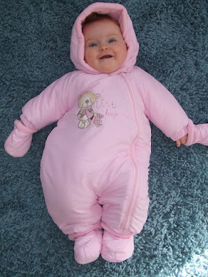 A few months ago we were given a snow suit for Gracie. It looks so cosy and i've been waiting for it to be cold enough for Gracie to wear it. The weather is just amazing at the moment and i've been out in the garden today weeding in just a vest top. Yesterday it felt a little fresh so i took the opportunity to put Gracie in her snow suit whilst we went for a bike ride. It turned out to really warm outside and we were both sweating by the time we got home! Anyway, I took a photo of her as she looked so cute and as fat as babies come in it!